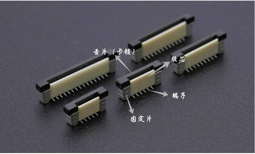 為實現精密集成,FPC連接器的構成越來越小,占用的空間也越來越薄,FPC連接器的構成分別由膠芯、端子、固定片、舌片四部分組成。